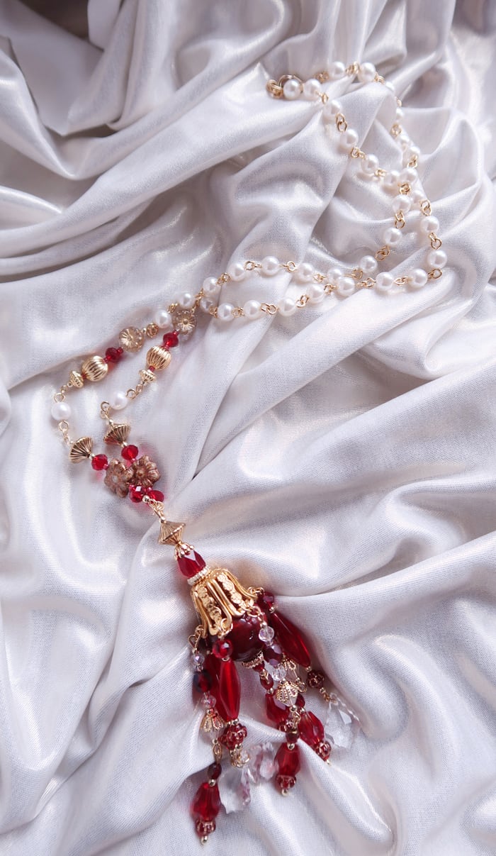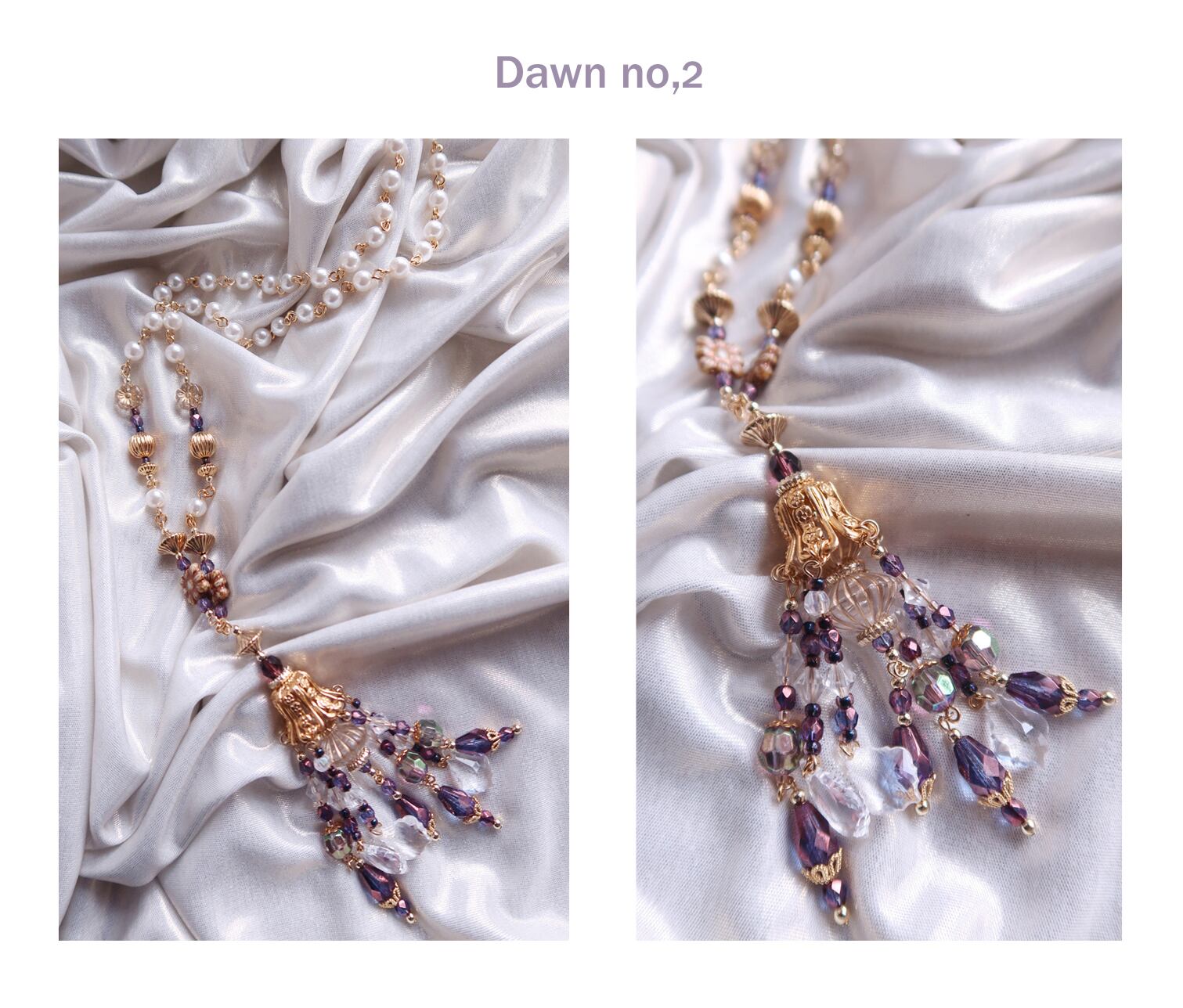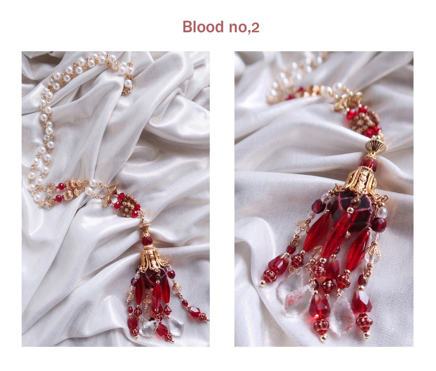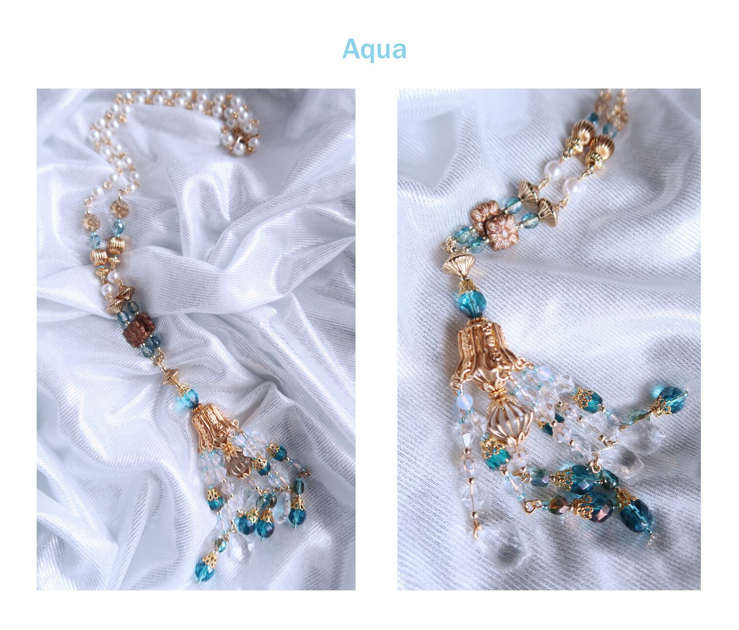 名前の通り、"白夜"、"夜明け"、"血液"、”真夜中”、”水”のイメージをネックレスに落とし込みました。