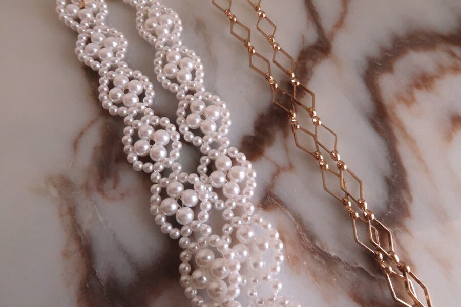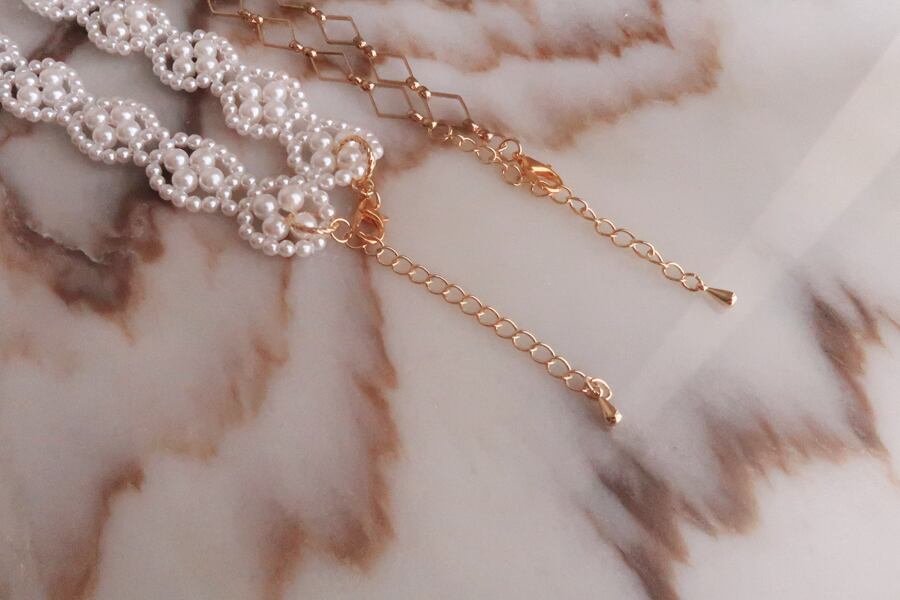 チョーカーのパールレースは一際首元を華やかに演出してくれます。チェーンタイプはシンプルな美しさが、様々なお洋服に合わせる事が出来そうです。