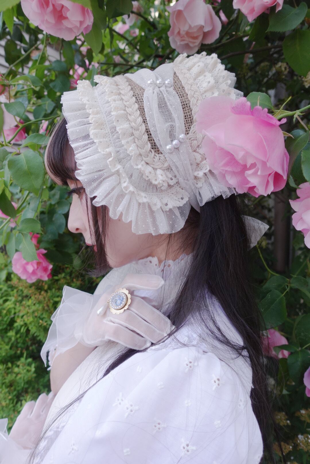 チュールレースのフリルをたっぷり使った初夏にぴったりのヘッドドレスです。