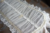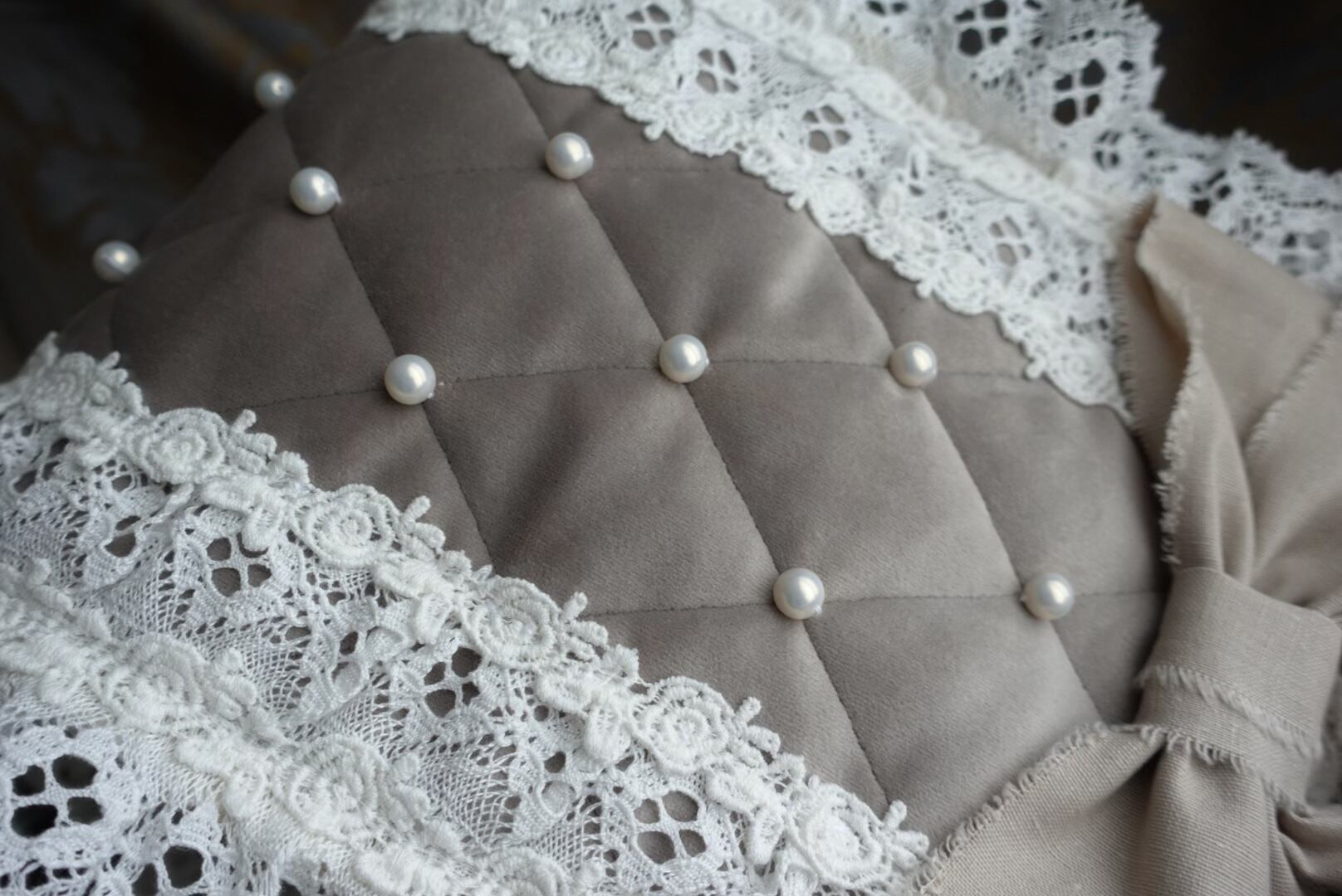 グレーのベロアキルティングを使用した豪華なボンネットです。キルティングに合わせてパールを縫い付けています。