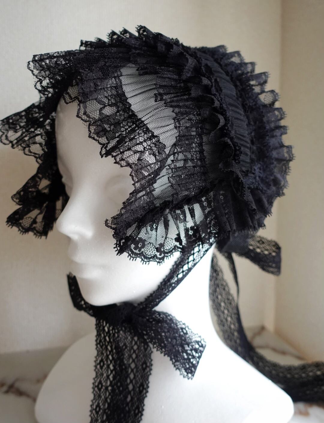 薄いプリーツのチュールレースを使用したレースボンネットになります。