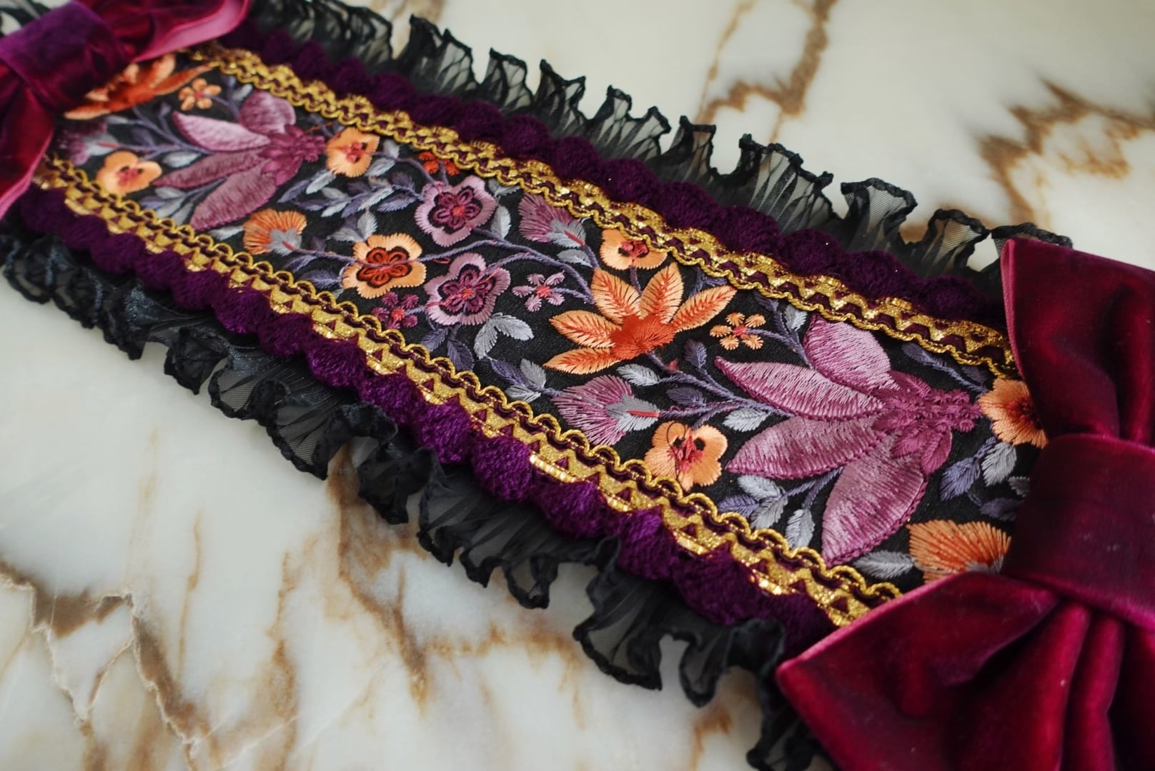 インド刺繍ブレードを使用したヘッドドレスです。それぞれ美しい刺繍お花が咲いています。ブレードによって合わせるレースなどを変えています。